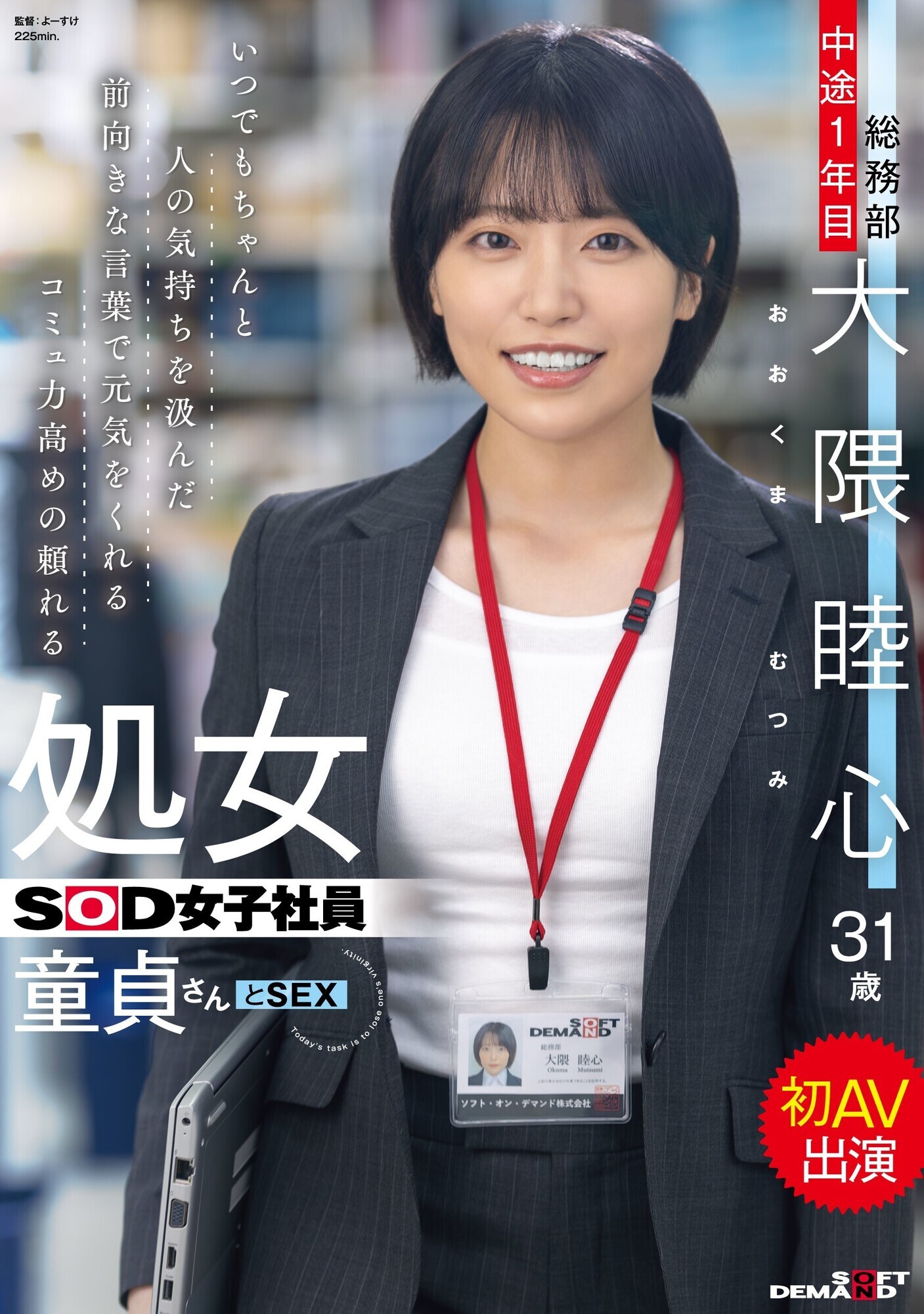 このアダルト動画動画の作品名は 「いつでもちゃんと人の気持ちを汲んだ前向きな言葉で元気をくれるコミュ力高めの頼れる処女SOD女子社員 童貞さんと初AV出演 総務部 中途1年目 大隈睦心 31歳」。 監督は